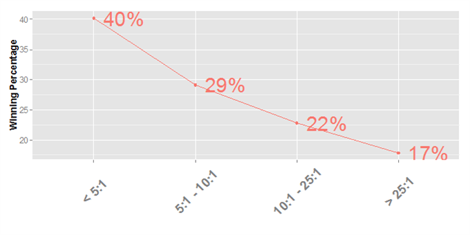 En el anterior gráfico podemos ver claramente como el porcentaje de operaciones ganadoras se va reduciendo en función de tomar un mayor apalancamiento.